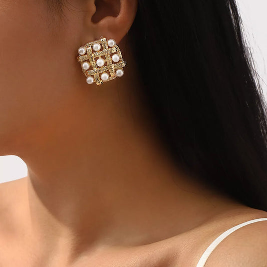 Square Dancing Pearl Stud Earrings